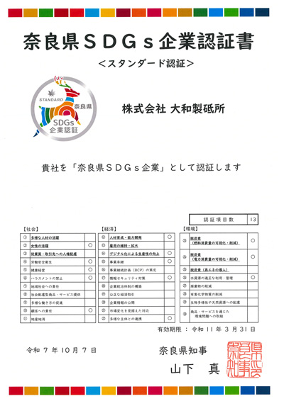 大和製砥所はSDGsの実現に貢献します。 株式会社大和製砥所では、持続可能な未来を目指し、社会・環境への責任を果たすため、国連の「持続可能な開発目標(SDGs)」に取り組んでいます。当社の製品やサービスを通じて、より良い社会の実現に向けた行動を進め、地球環境への配慮と人々の生活の向上を目指しています。